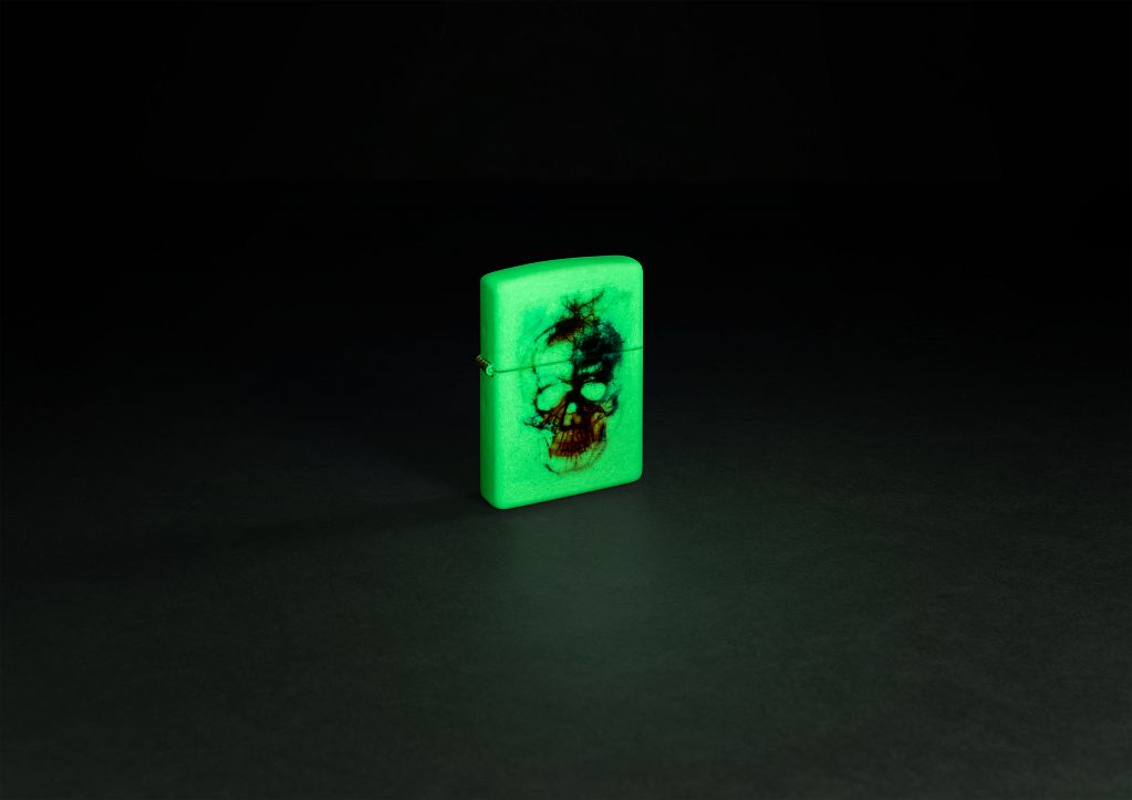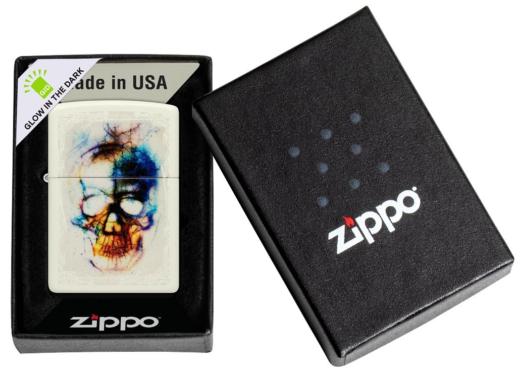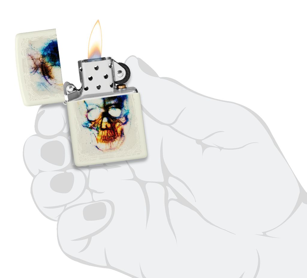 Vibrant, cheerful watercolors coalesce to create a menacing skull in this striking Color Image design, which comes to life after dark thanks to our proprietary Glow-in-the-Dark finish. Comes packaged in a gift box. For optimal performance, fill with Zippo lighter fuel.