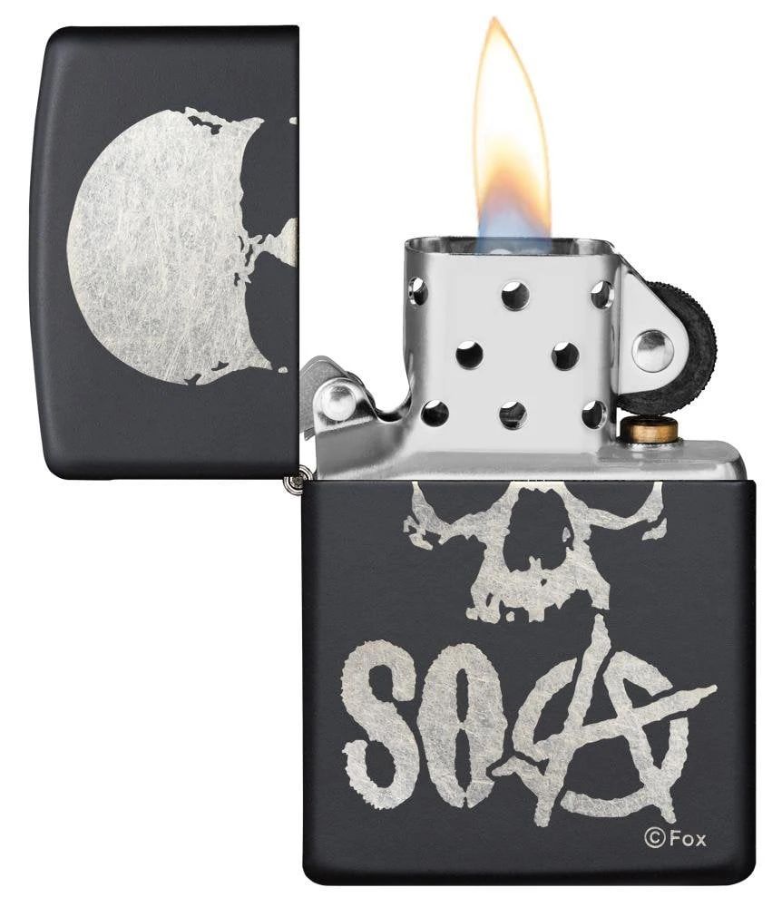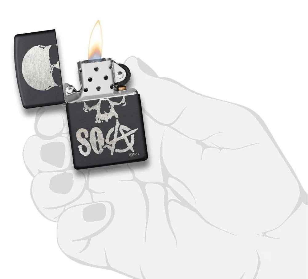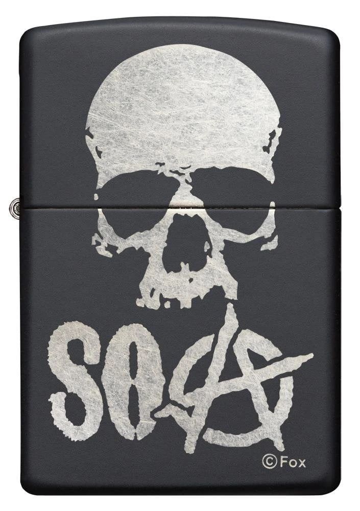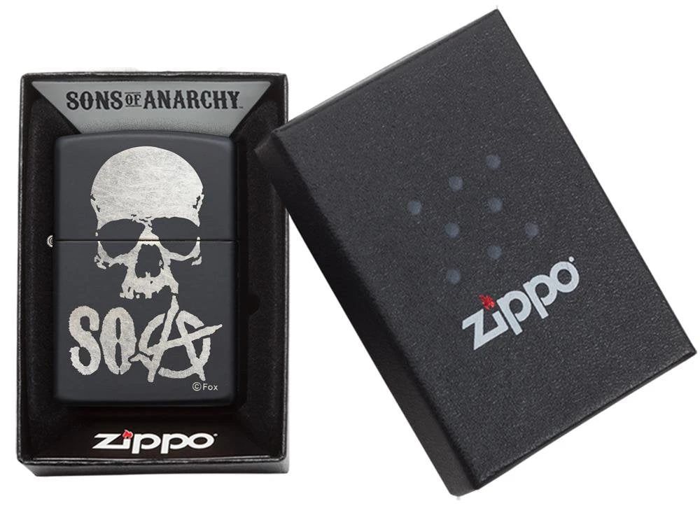 Add this Sons of Anarchy™ lighter to your collection today. Finished on a Black Matte lighter this chrome plated design displays the iconic Sons of Anarchy™ logo and a skull design. Comes packaged in a gift box. For optimal performance, fill with Zippo lighter fuel.